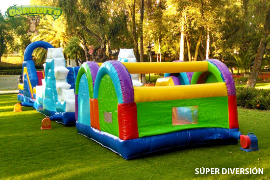 Puedes escoger 3 de los siguientes inflables para hace el juego a tu gusto: doble arco sin túnel, mini iceberg, obstáculos, escaladilla, triple arco, obstáculos 2, resbaladilla mágica y resbaladilla justicieros.