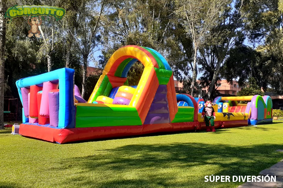 Puedes escoger 3 de los siguientes inflables para hace el juego a tu gusto: doble arco sin túnel, mini iceberg, obstáculos, escaladilla, triple arco, obstáculos 2, resbaladilla mágica y resbaladilla justicieros.