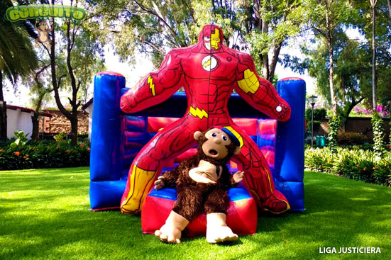 Súper divertido inflable de superhéroes, como Flash, Superman y Capitán América los favoritos de chicos y grandes.